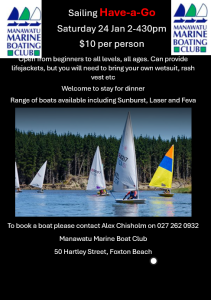 At 2 p.m. on Saturday 24th of January, the Manawatu Marine Boating Club at Foxton Beach is running a dinghy sailing have a go session – suitable for novice or experienced sailors. For a donation of 10 dollars, arrive at 1.45 p.m. with gear to get wet in and they will provide all the rest. There are showers for after then you can be signed into the club for a delicious dinner and a drink at the bar.